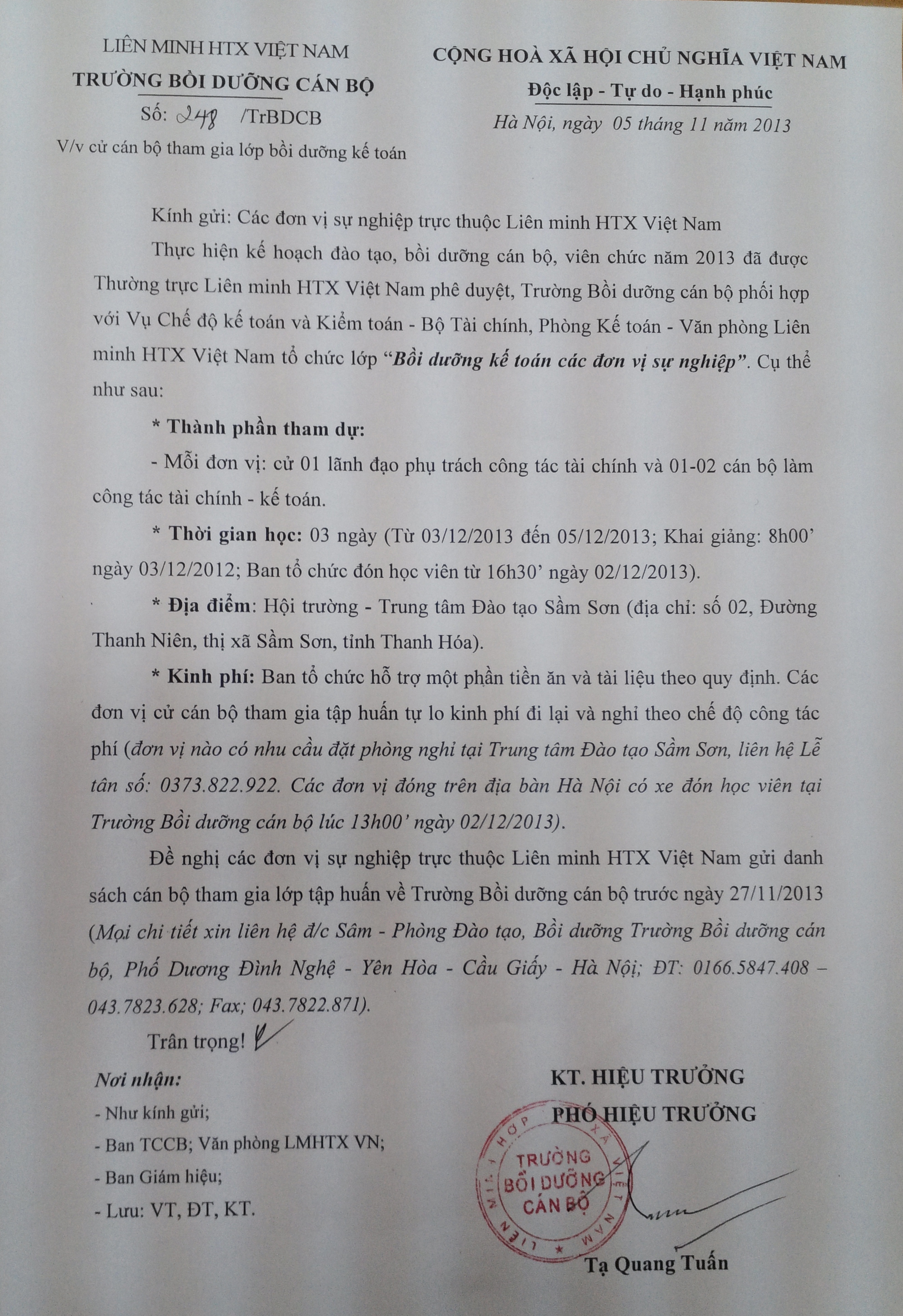 Đề nghị các đơn vị sự nghiệp trực thuộc Liên minh HTX Việt Nam gửi danh sách cán bộ tham gia lớp tập huấn về Trường Bồi dưỡng cán bộ trước ngày 27/11/2013 (Mọi chi tiết xin liên hệ đ/c Sâm - Phòng Đào tạo, Bồi dưỡng Trường Bồi dưỡng cán bộ, Phố Dương Đình Nghệ - Yên Hòa - Cầu Giấy - Hà Nộị; ĐT: 0166.5847.408 – 043.7823.628; Fax; 043.7822.871).