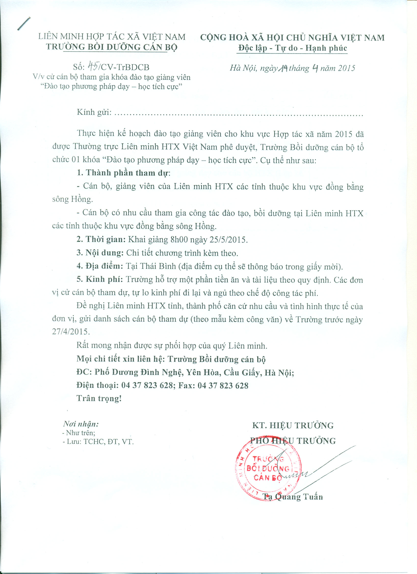 Công văn số 45/CV-TrBDCB về việc cử cán bộ tham gia khóa đào tạo giảng viên "Đào tạo phương pháp dạy - học tích cực"
